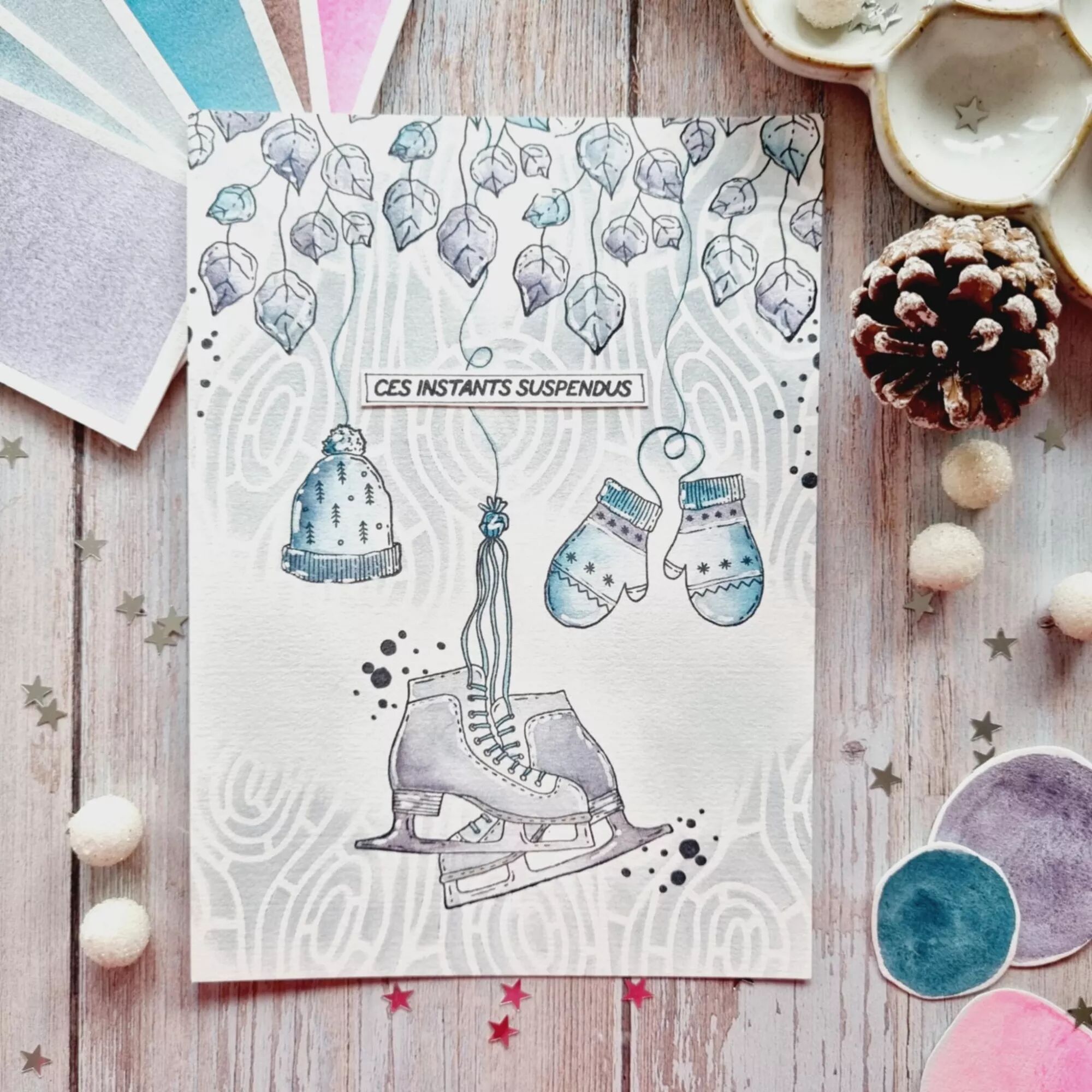 thème hiver, patins à glace, fleurs, pomme de pin, perce-neige