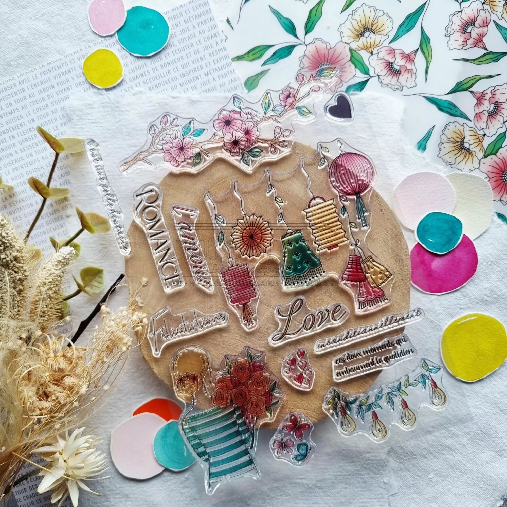 Planche avec des tampons : amour, love, romance, ballons, supsnesions, ampoules, éclairages, papillons, coeurs, blanches fleuries