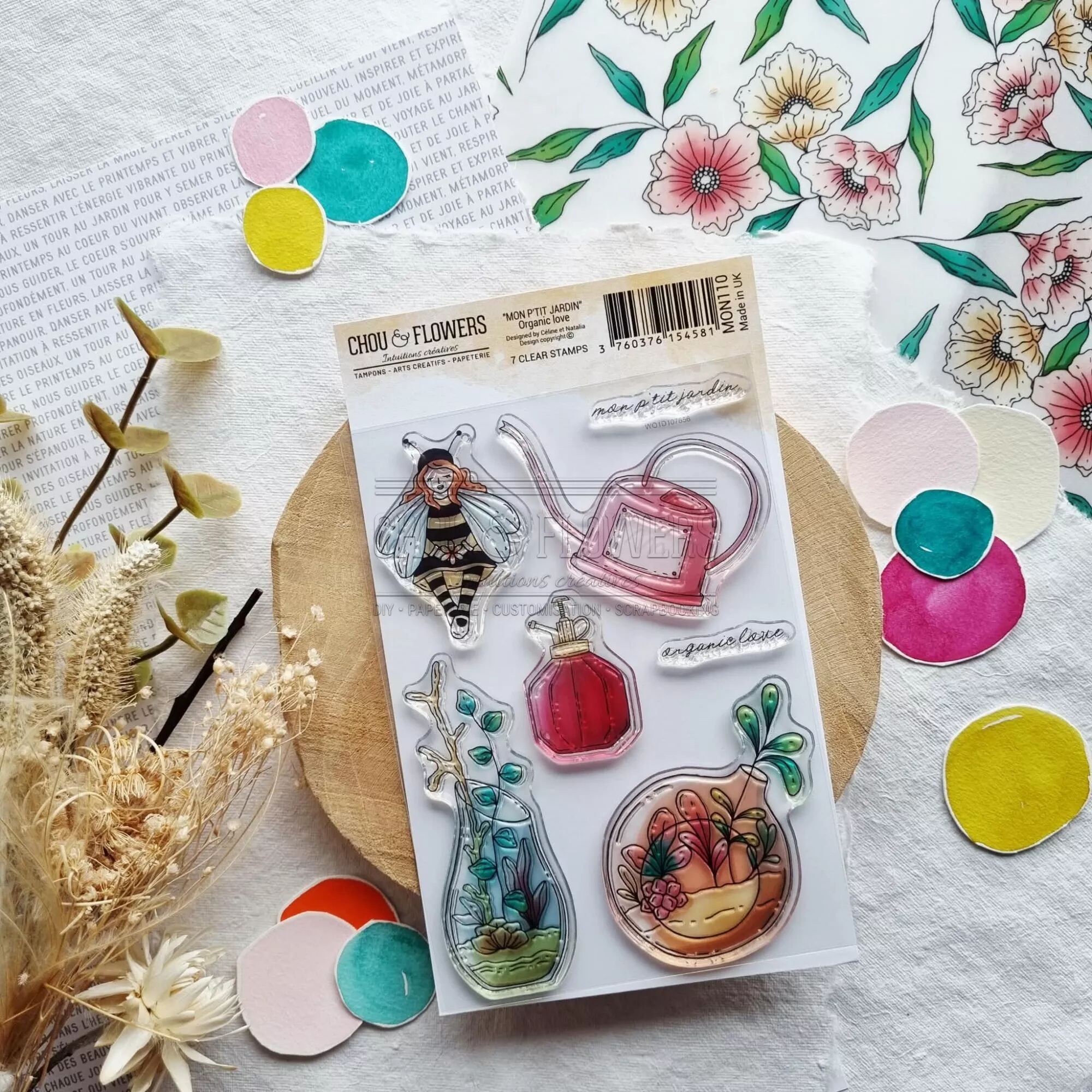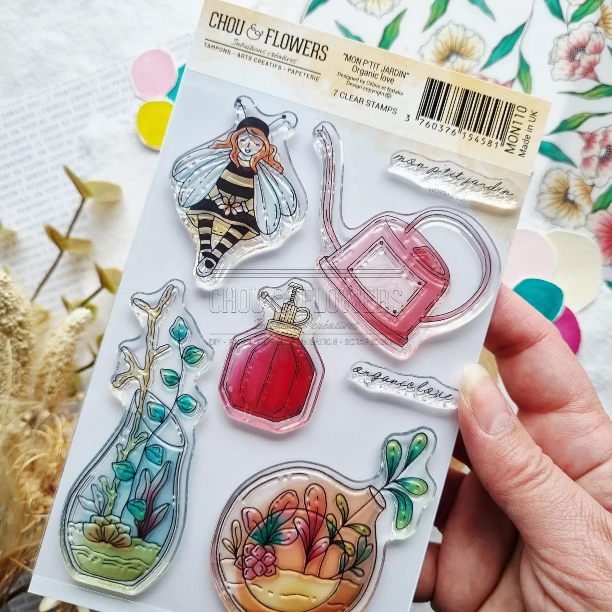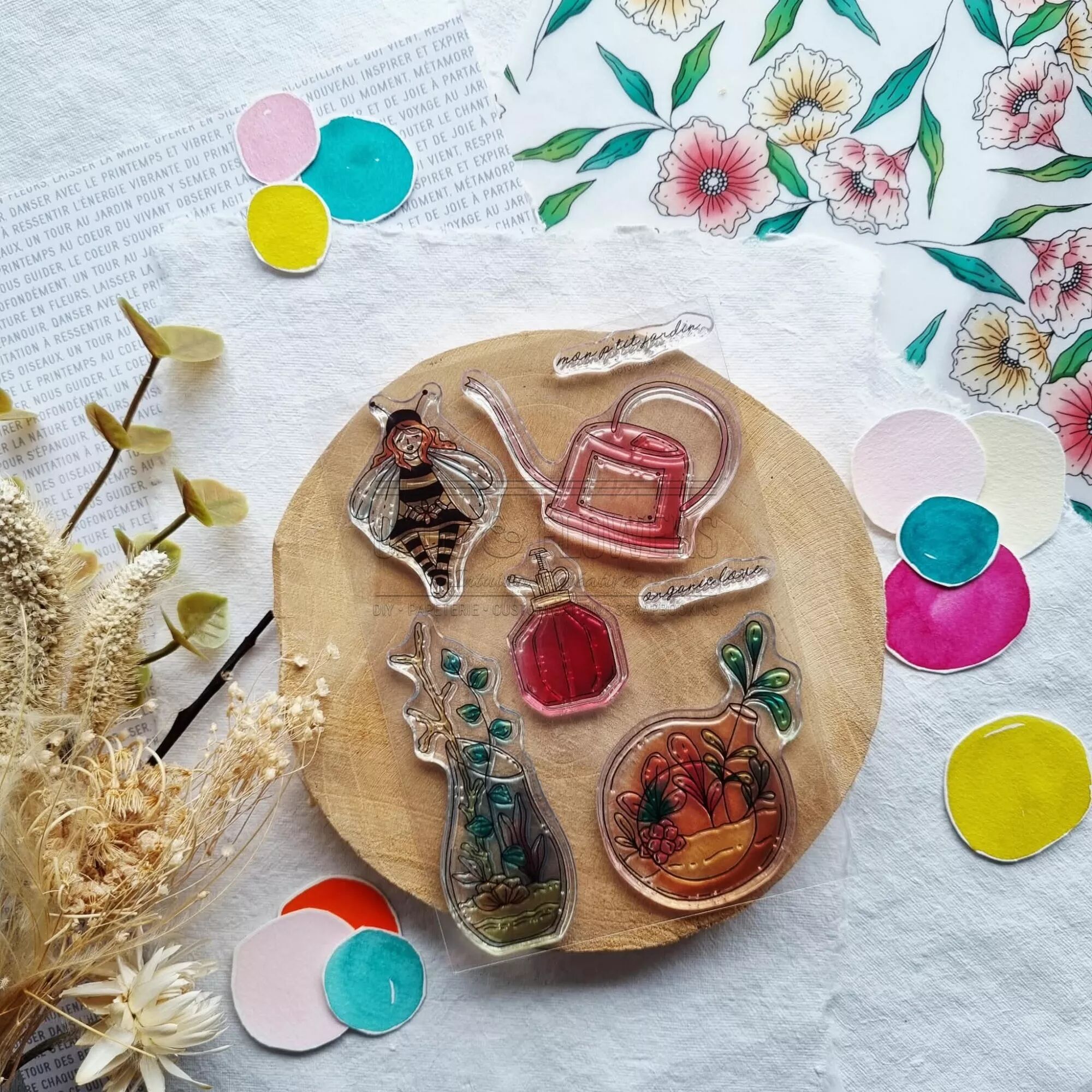Planche avec des tampons : personnage abeille, arrosoir, 2 vases fleuris, joli flacon pulvérisation