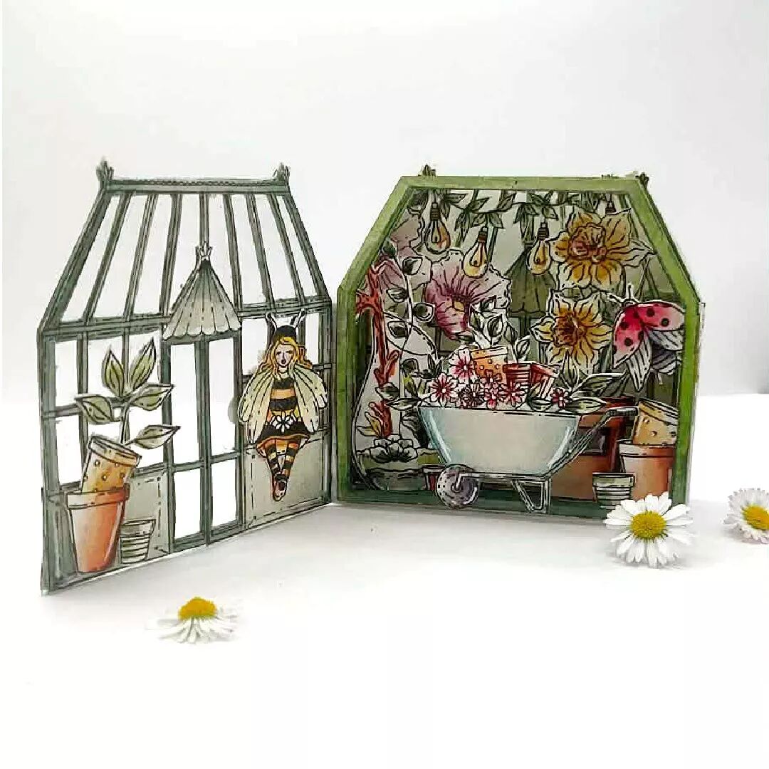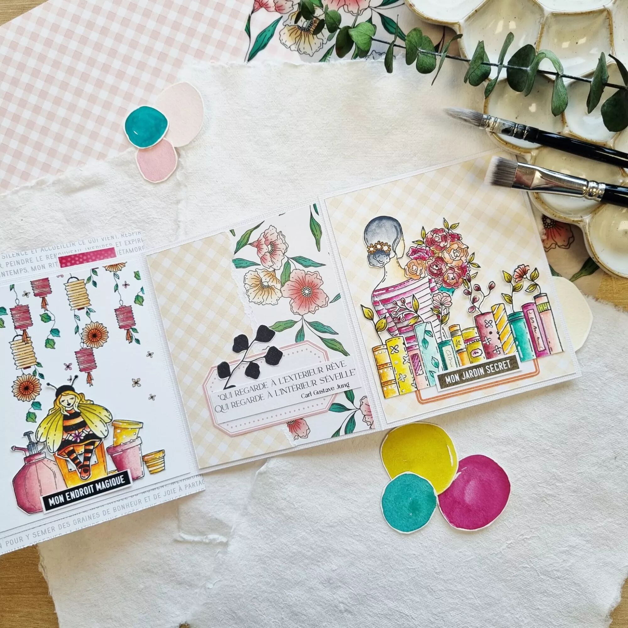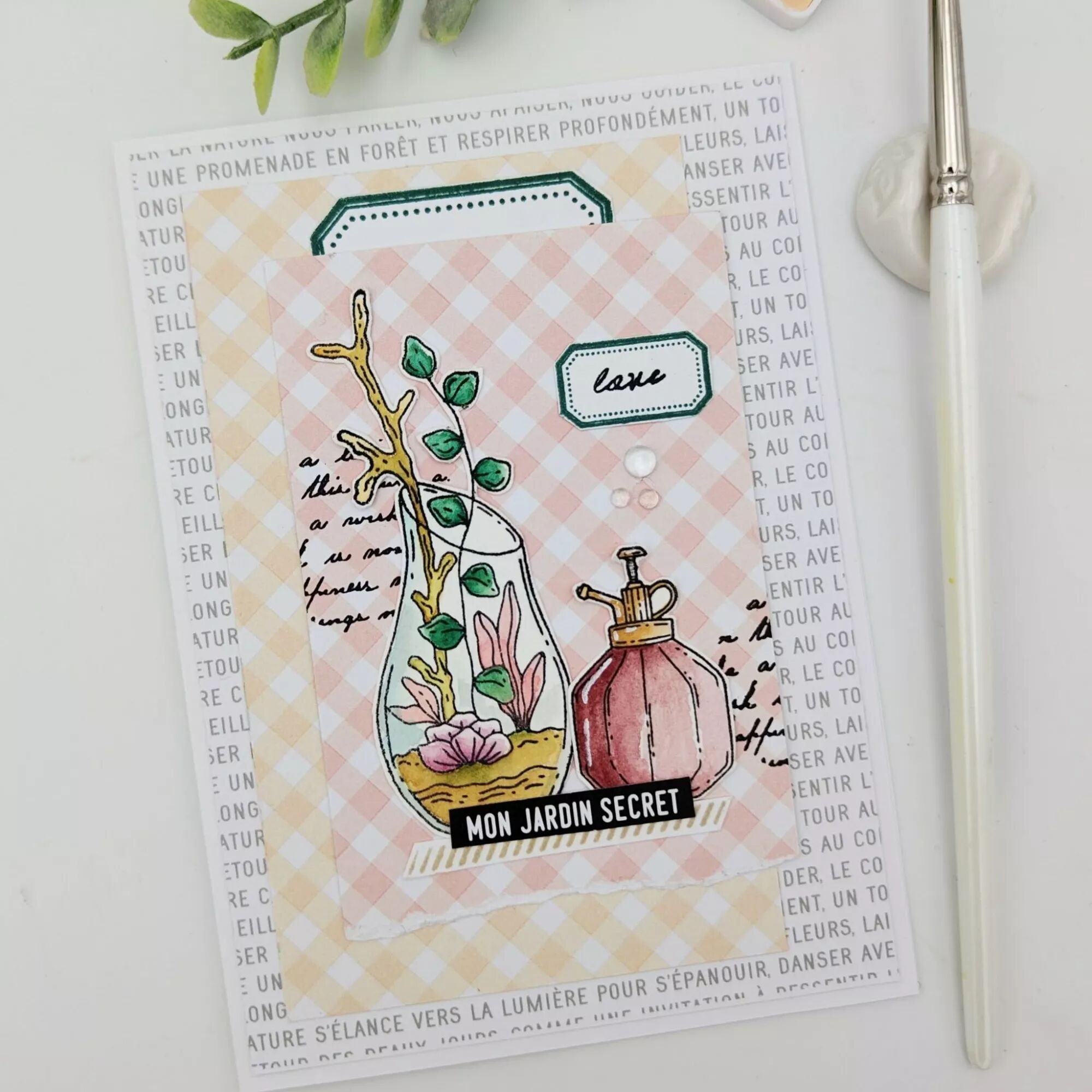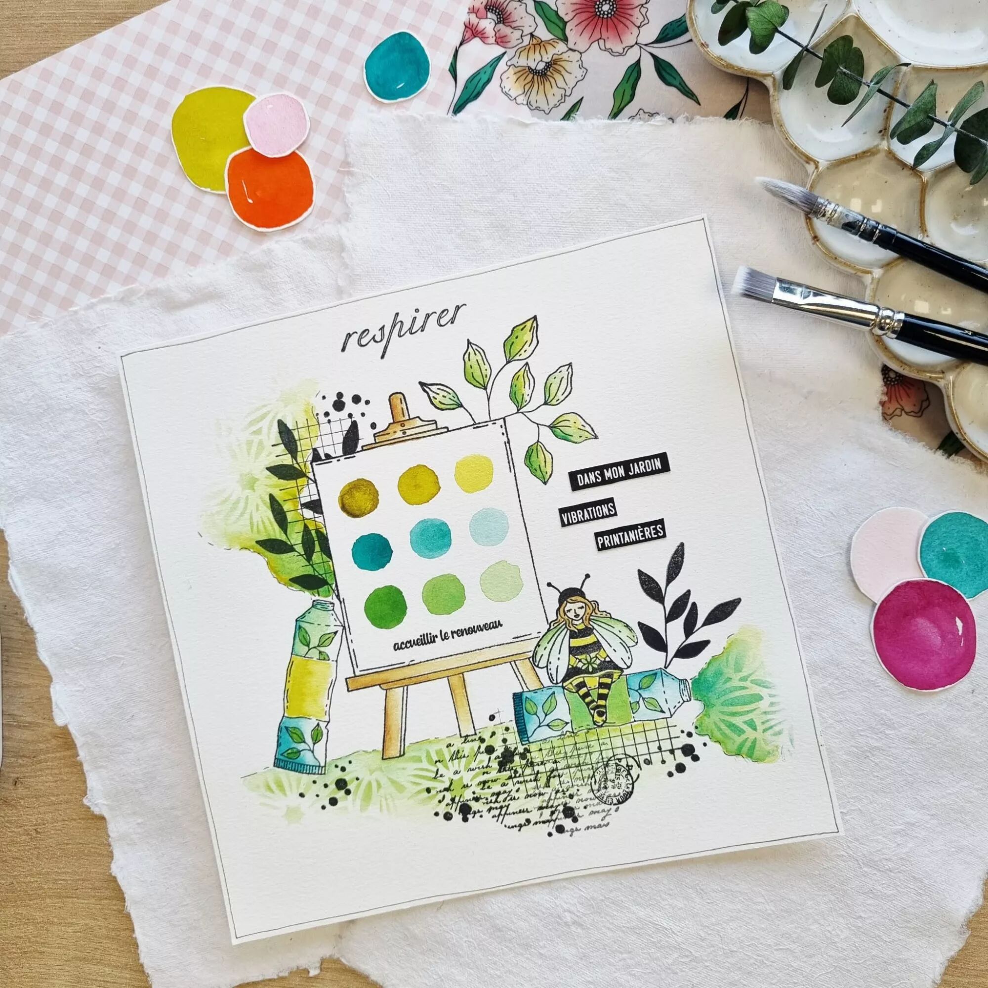 Planche avec des tampons : personnage abeille, arrosoir, 2 vases fleuris, joli flacon pulvérisation