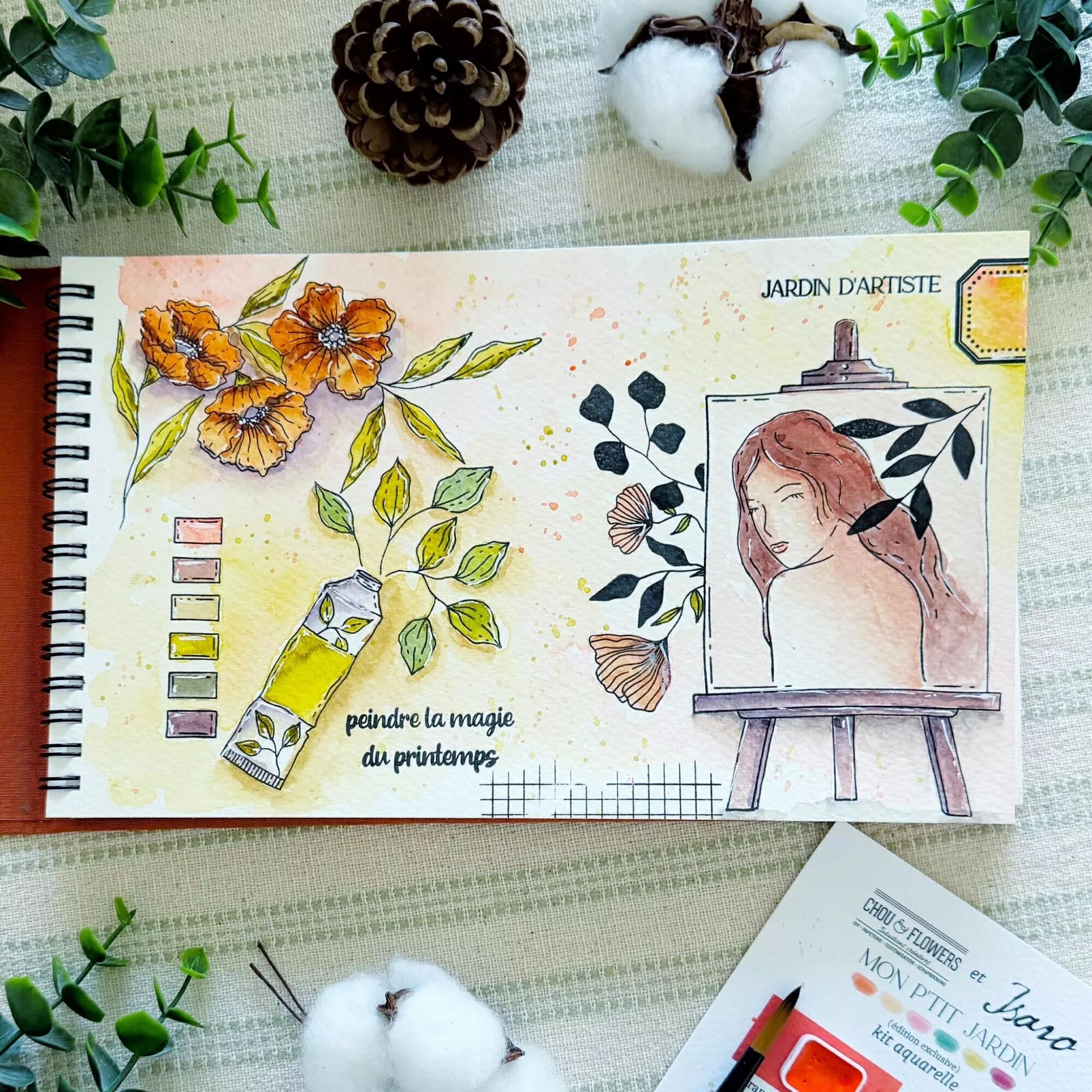 Planche avec des tampons : tube de peinture déco, motifs floraux