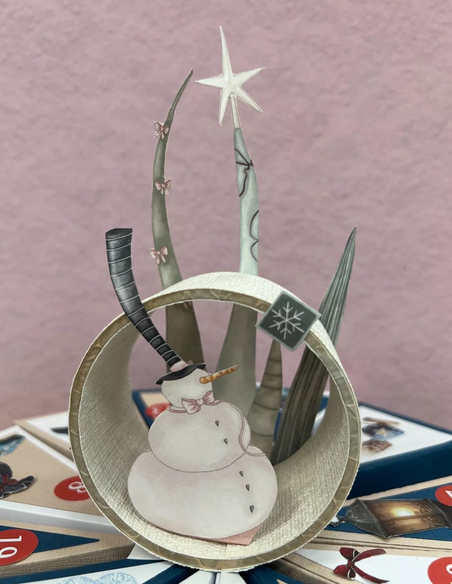 sapins et bonhommes de neige sur fond rose