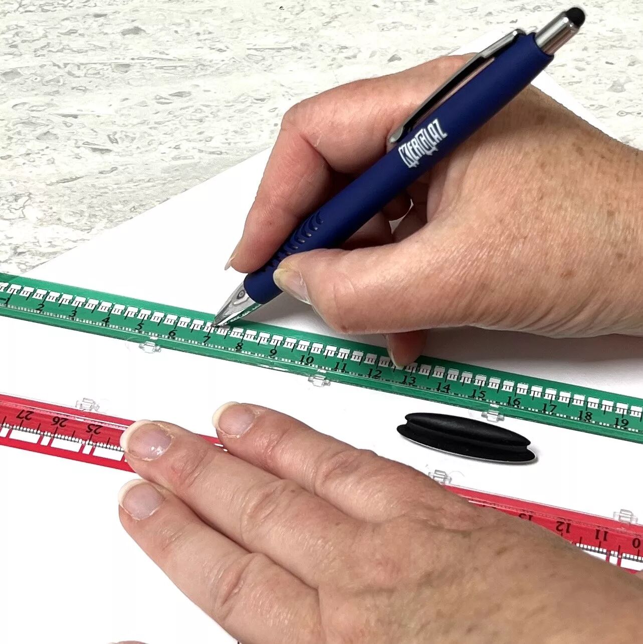 La finesse des volets permet de garantir un confort de traçage optimal avec tous types de stylos (à bille, plume, feutre, marqueur), de crayons, de porte-mines et de faciliter leur rangement par pivotement dans le corps de règle.